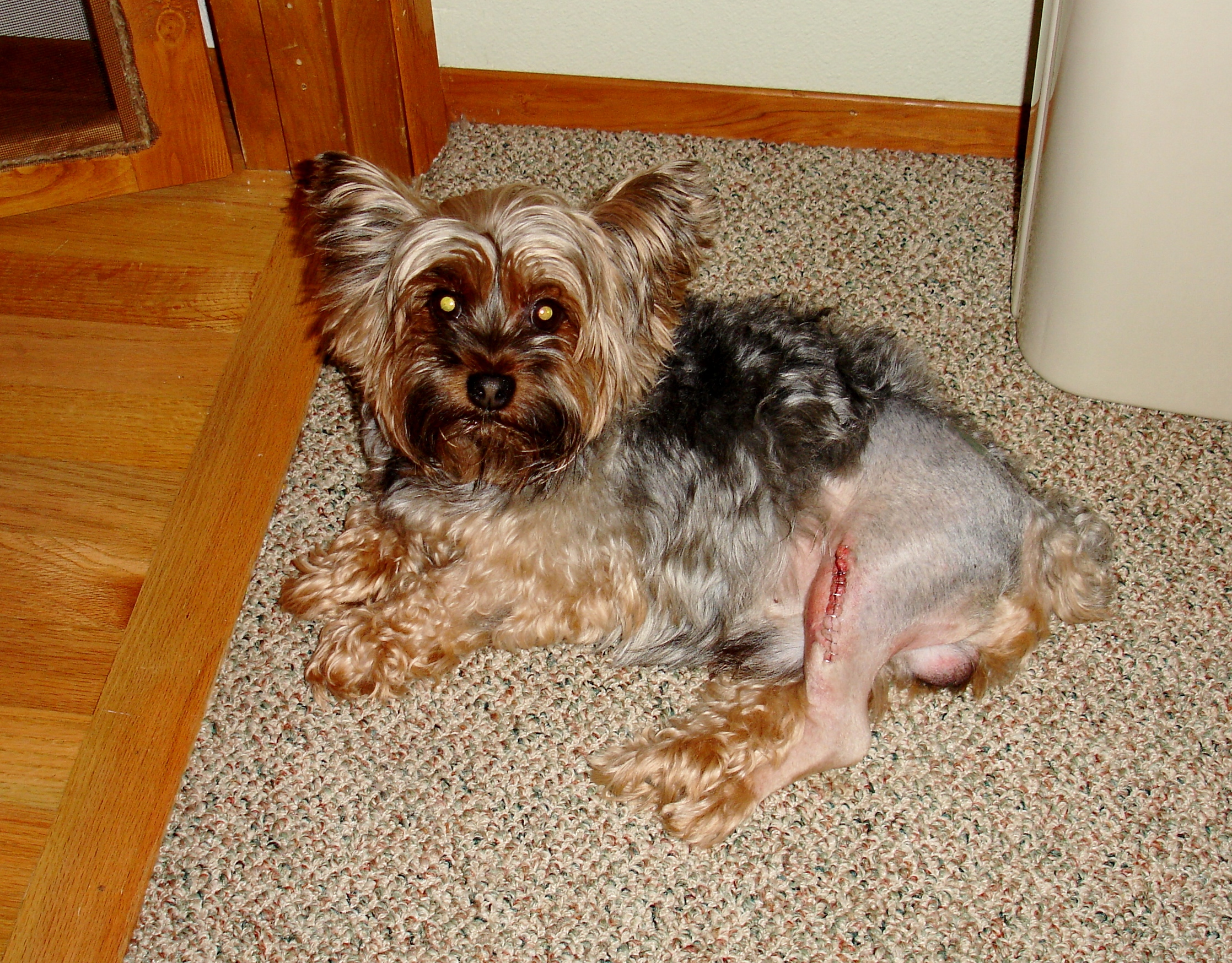As most of you may know, my little yorkie Max, has surgery last week to repair the ACL he tore in his left knee. This is a picture of him taken on Saturday just inside the doorway of my inside craft room.